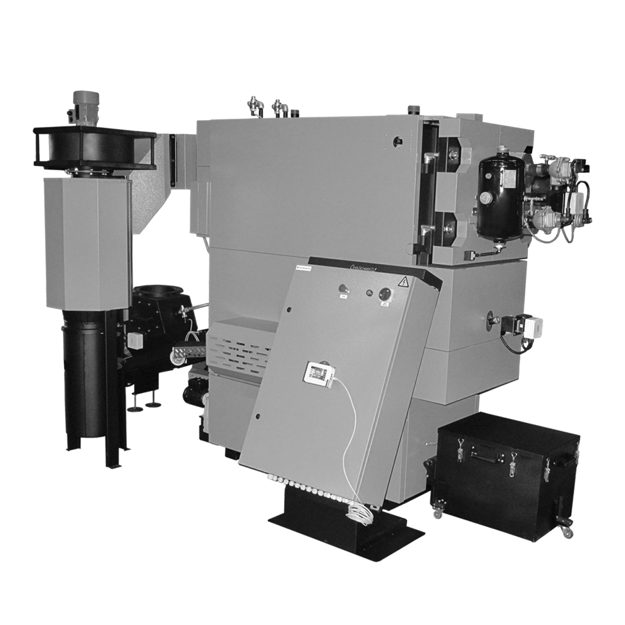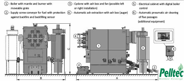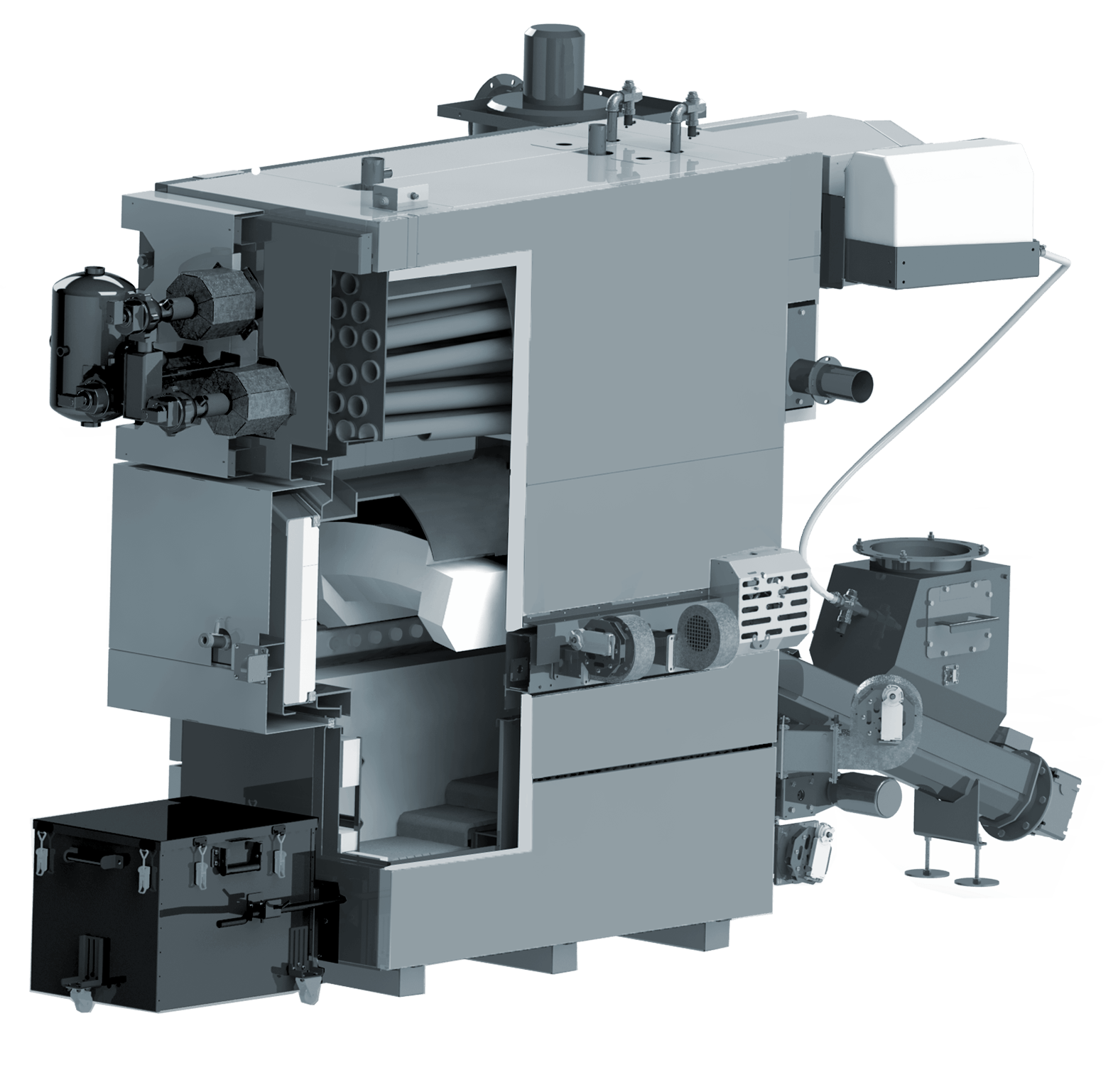 Pelletspanna som levereras som en komplett färdig enhet med integrerad brännare och styrning. Pannan har ett rörligt roster och en lamdastyrning på rökgaserna. Brännkammaren är inredd med keramiska stenar. Pannan uppfyller den högsta Europeiska standarden enligt EN 303-5:2012 (Klass 5) vilket innebär mycket låga utsläpp samt en hög verkningsgrad.